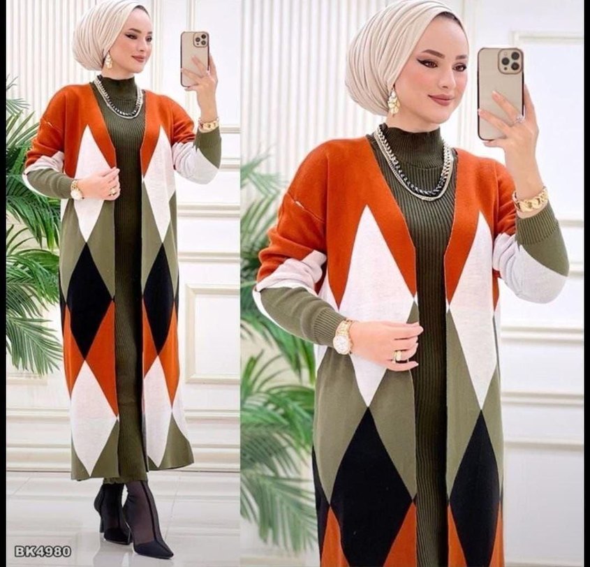 Renkli Etnik Desenli Uzun Triko Hırka elbise