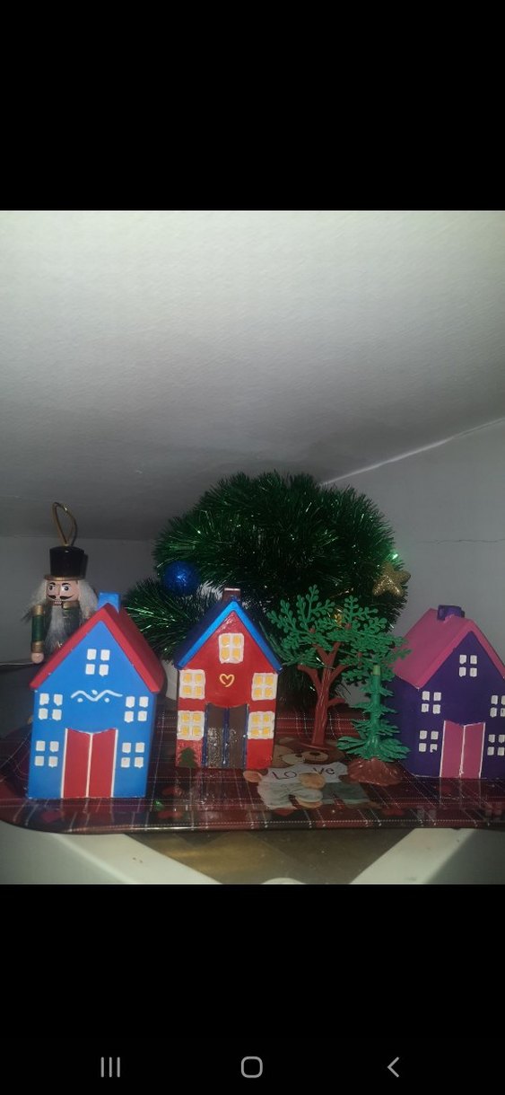 Canlı renklerde boyanmış alçı ev figürleri ve dekoratif ağaçlar içeren renkli bir set. evlerin tane fiyatıdır istenilen renkte boyanır