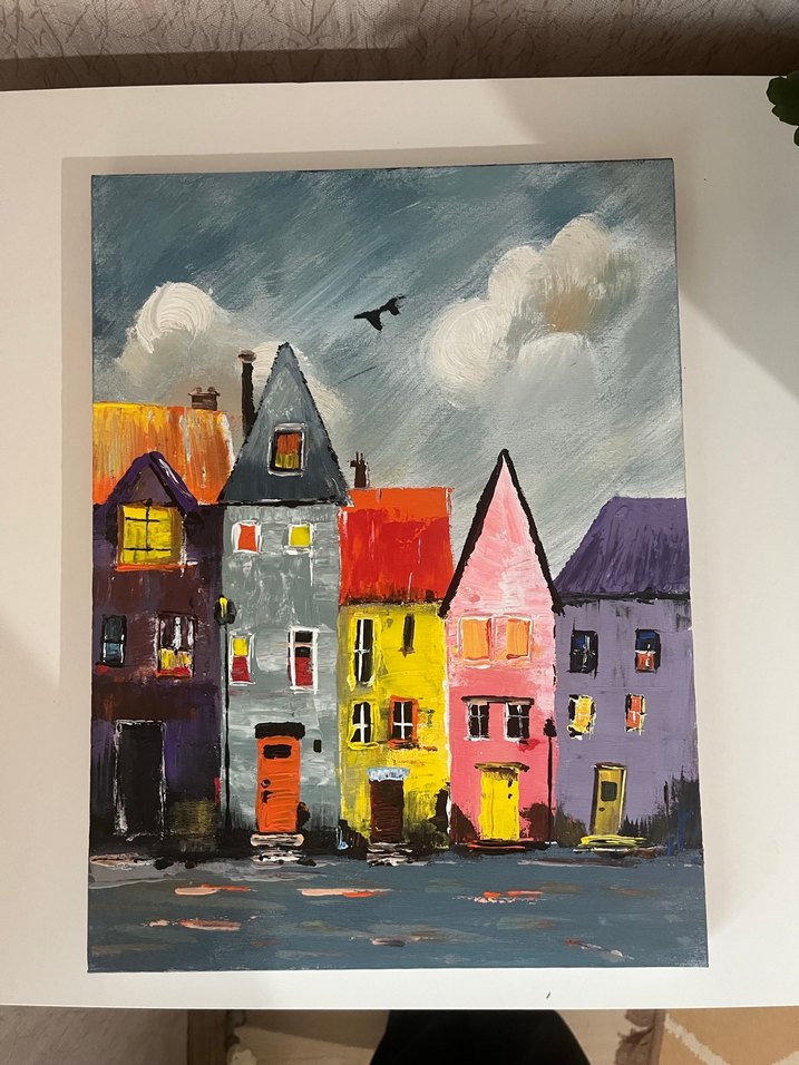 Bu akrilik tablo, karanlık canlı tonlarda, bulutlu gökyüzü altında uçan bir kuşla renkli evleri tasvir ediyor. 30*40 boyutunda çerçevesiz Evinize işinize sıcaklık getirsin. Kendim yaptım #tablo #akrilikboyama