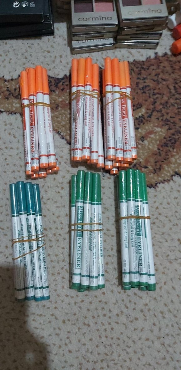Turuncu, yeşil ve mavimsi tonlarda renkli eyeliner kalemlerden oluşan set, lastik bantlarla gruplandırılmış. ️ 10 adet