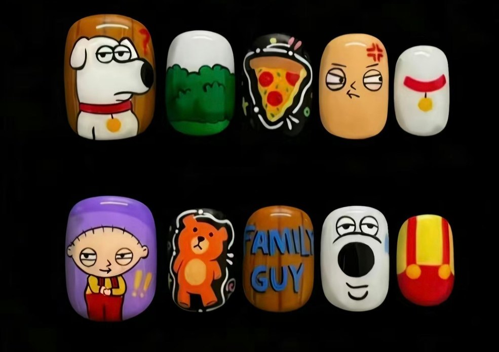 Family Guy karakterleri ve temalı tasarımlar içeren renkli tırnak süsleri. Tırnaklarınıza eğlenceli bir dokunuş katın.