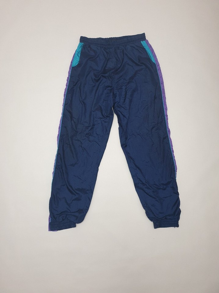 Rahat kesim, koyu mavi renkli, renkli yan şeritlere ve fermuarlı ceplere sahip sentetik kumaştan erkek eşofman altı. ️