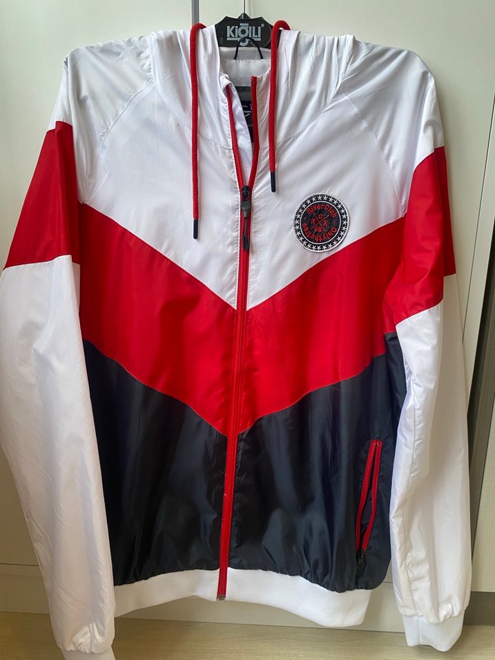 Bu erkek yağmurluk, uzun kollu, fermuarlı ve yakalıdır. Parlak sentetik kumaştan üretilmiş, beyaz, kırmızı ve siyah renklerde, baskılı amblemli, spor şıklık için uygundur. ️