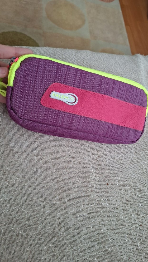 Renkli mor çocuk kalemliği, fermuarlı kapama ve pembe şerit detayına sahiptir. Desensiz ve kullanımı kolaydır.