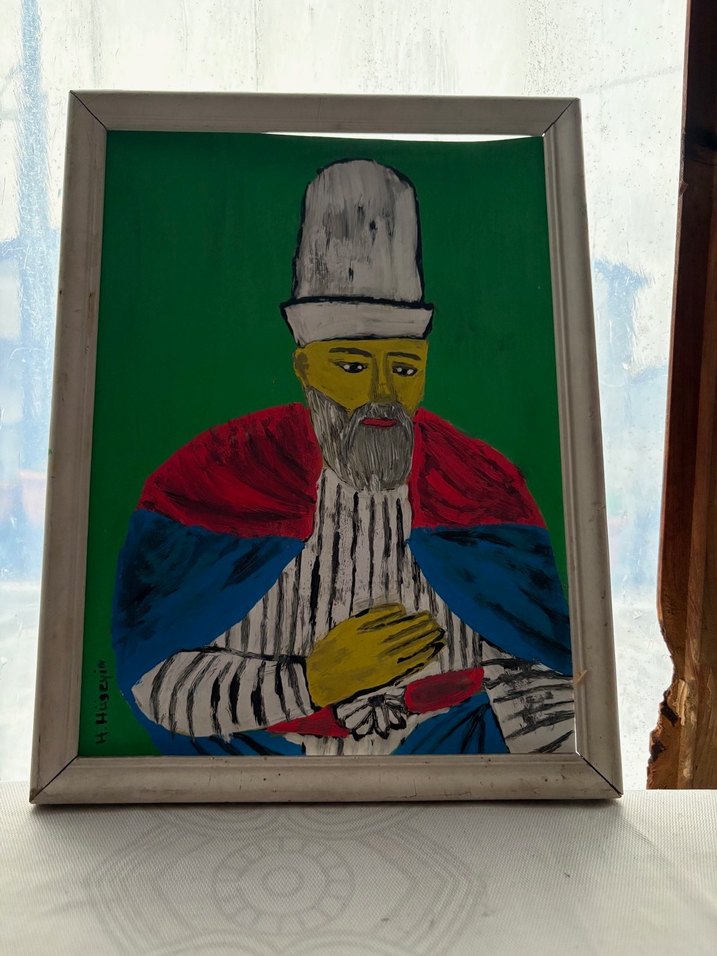 Bu tablo koyu yeşil arka plan üzerinde uzun şapkalı ve cüppeli çok renkli bir figür içerir. Canlı renkler ve klasik tarz kullanılmıştır. Hacı Bektaşi Veli resmedilmiştir. Karton üzeri akrilik boya. Ahşap çerçevesinde. Hasan Hüseyin imzalı 20×27 cm ölçüsünde