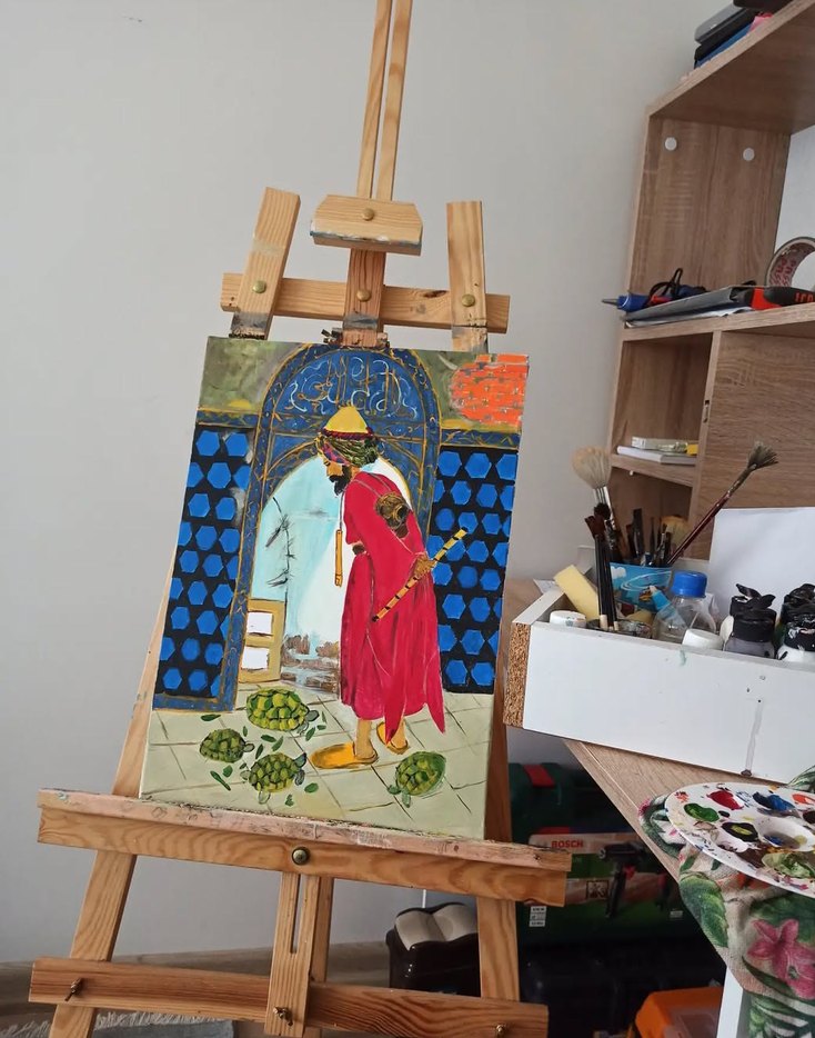 Koyu ve canlı renklerle yapılmış, kırmızı elbiseli bir figür ve kaplumbağaların olduğu detaylı bir kemer arka planlı tablo. kaplumbağa terbiyecisi 35-50 boyutunda.