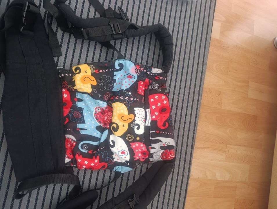 Koyu zemin üzerine renkli fil desenleri bulunan bebek taşıyıcı. Konforlu dolgulu kayışlar ve güvenli tokalar içerir.