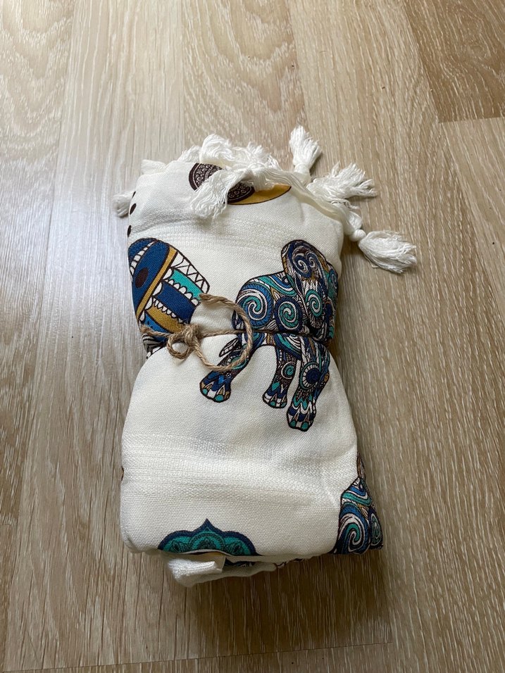 Renkli fil desenleri ve püskül detayları olan beyaz peştemal yumuşak kumaştan rahat taşıma sağlar.
