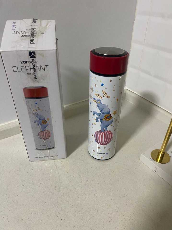 Beyaz gövdesi ve kırmızı kapağıyla renkli fil desenli termos.İçecekleri sıcak tutar ve taşınması kolaydır. Ürün sıfır ve kutuludur 500 ml dir
