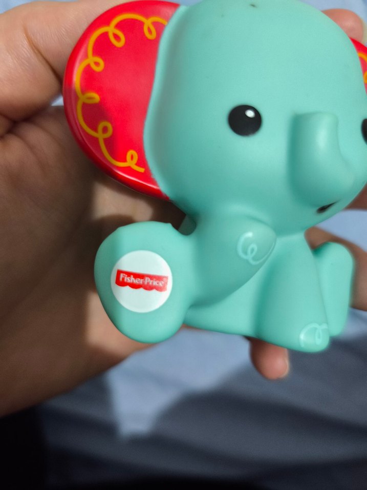 Fisher-Price markalı, renkli turkuaz fil figürlü diş kaşıyıcı ve çıngırak, bebekler için güvenli ve eğlenceli bir oyuncaktır. Banyo oyuncağı