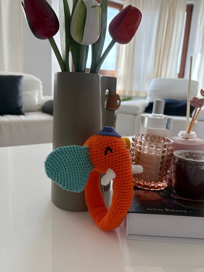 Renkli fil figürlü, yumuşak dokulu diş kaşıyıcı ve çıngırak, bebeklerin hem oynayıp hem dişlerini kaşıması için uygun. El yapımı kendim ördüm hiç kullanılmad.