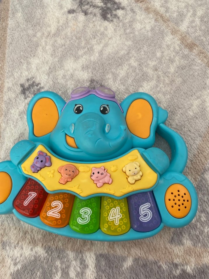 Renkli fil şeklinde eğitici oyuncak, 1'den 5'e kadar numaralı tuşlar ve hayvan figürlü butonlar içerir. Hiçbir sorunu yoktur sağlam çalışır vaziyettedir