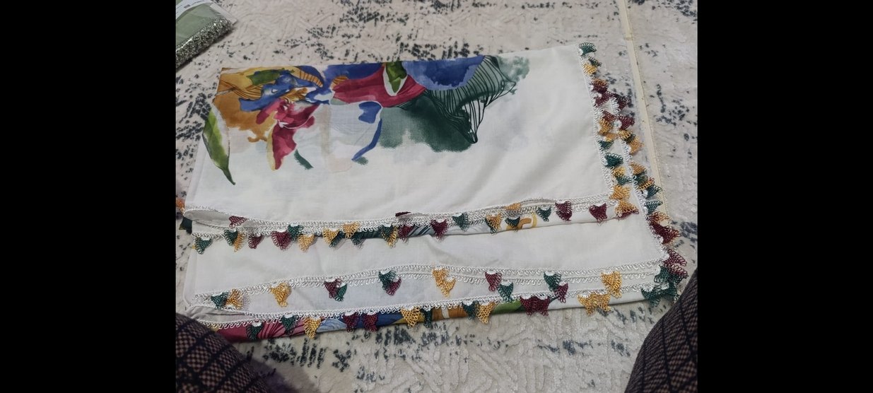 Renkli bohem tarzda, kenarlarında fırfır detayları bulunan yumuşak dokulu kadın şalı. reyyan 4 kenar igne oyasi