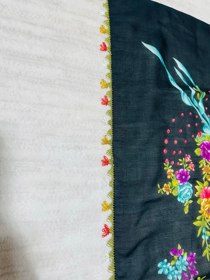 Çeyizlik yazma sığ model.Kadın şal, koyu zemin üzerine canlı çok renkli çiçek desenleri ve ince fırfırlı kenarlarla bohem tarzını yansıtıyor.