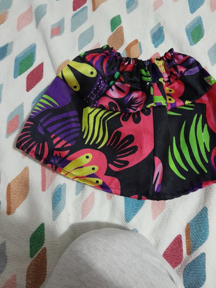 Sentetik kumaştan, bol kesim ve fırfırlı detaylara sahip renkli, desenli kız eteği. düz tişört ve aynı renk çorap üzerine çok şık oluyor.