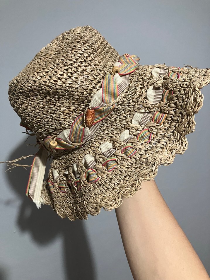 Hafif renkli çok renkli örgü kumaştan, fırfır detaylı, bohem tarzda kadın şapkası.