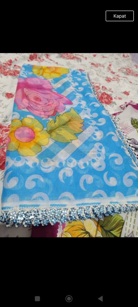 Kadınlar için renkli çiçek desenli, yumuşak sentetik kumaştan yapılmış fırfırlı fular. Bohem tarzını yansıtır.