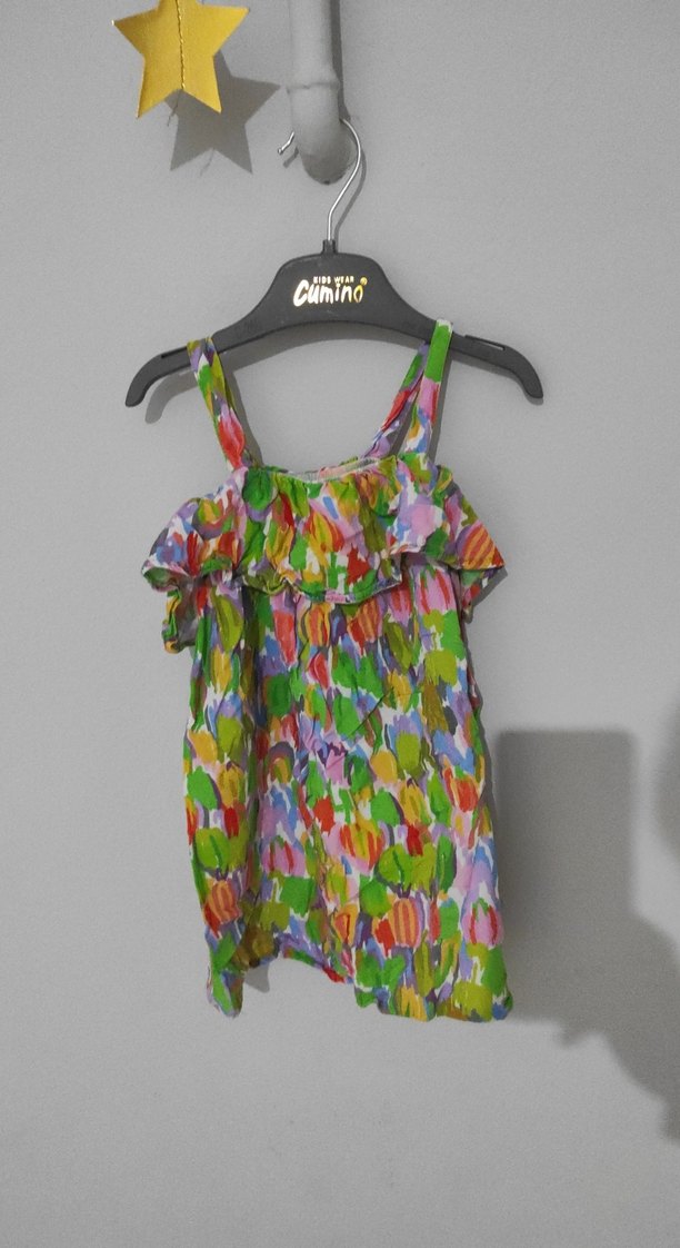 Renkli, kolsuz ve askılı, fırfırlı detaylı kız elbisesi. Gevşek kesimi ve canlı tie-dye deseniyle bohem ve retro tarz yansıtır.