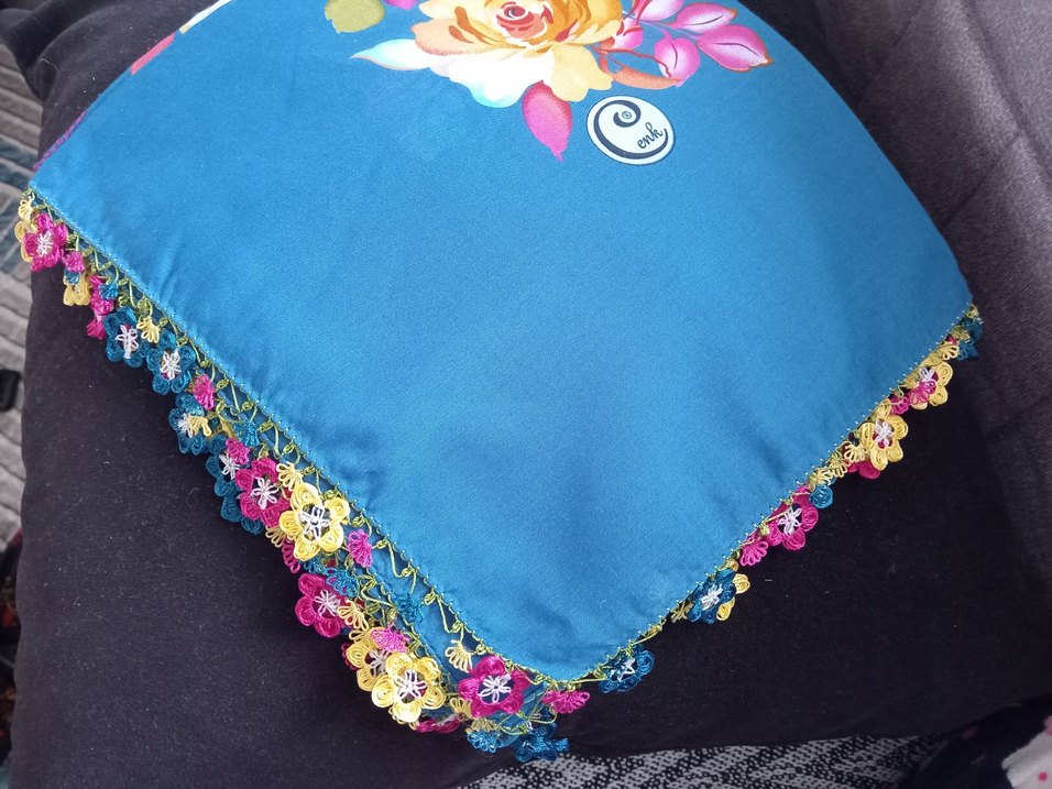Mavi tekstil fular, renkli fırfırlı kenarları ve çiçek işlemeleriyle bohem ve retro tarzını yansıtıyor.