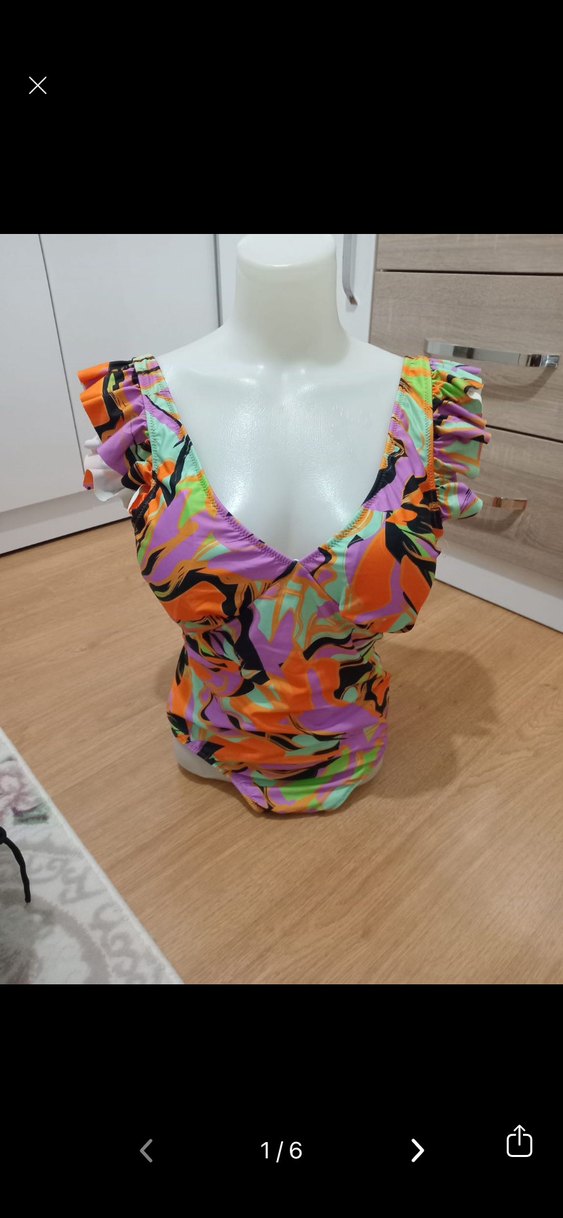 Renkli tie-dye desenli, fırfırlı omuz detaylı, kısa kesim ve dar kesim kadın mayo. Plajda pop kültür ve avangard tarzı yansıtır.