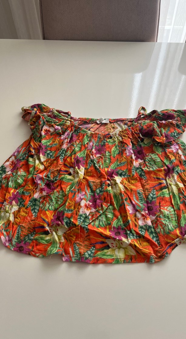 Renkli, straplez kız bluzu, bol kesim ve fırfır detaylarıyla bohem tarzını yansıtıyor.