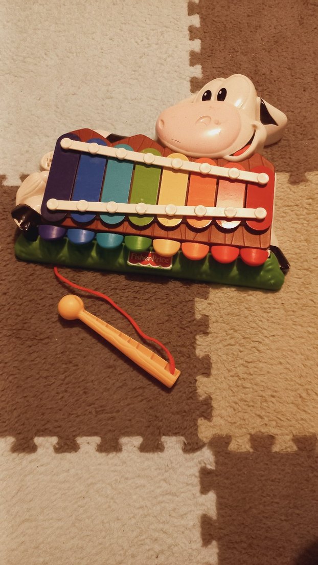 İnek figürlü, çok renkli ksilofon oyuncak. Müzik notalarını çalmak için tokmaklı, eğitici bir oyuncak .