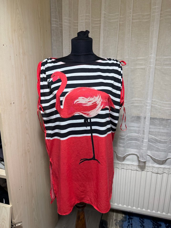 Rahat kesim, renkli flamingo baskılı, siyah-beyaz çizgili ve kırmızı alt kısmı olan mini tunik. Kolsuz, askısız ve drapeli tasarıma sahip, günlük kullanım için uygundur. Beach wear, plaj kıyafeti olarak satılıyor ben tunik gibi kullandım