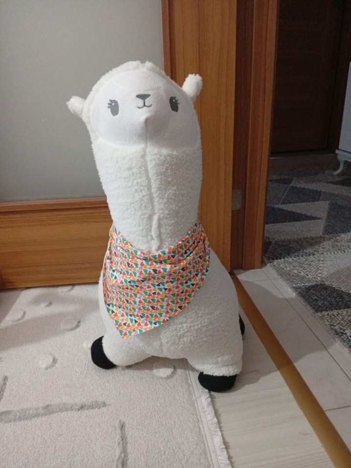 Yumuşak ve renkli, desenli fular takan peluş lama oyuncak. Beyaz gövdesi ve siyah ayaklarıyla sarılmak için uygun .kızım severek oynadı ama çok oyuncagı olduğu ıcın çabuk sıkıldı
