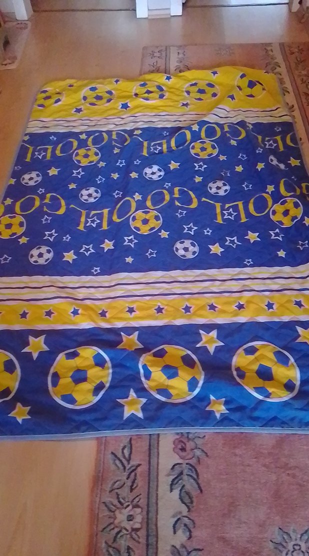 Yumuşak sentetik kumaştan yapılmış renkli çocuk battaniyesi. Mavi zemin üzerinde sarı ve beyaz futbol topları ve yıldızlar bulunur. ⚽ boyu:214 eni 207 cm renkli