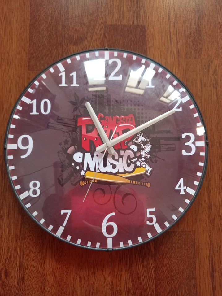 Renkli Gangsta Rap Müzik temalı duvar saati, beyaz sayılar ve canlı kırmızı arka plan ile tasarlanmıştır. Pil ile tıkır tıkır çalışır