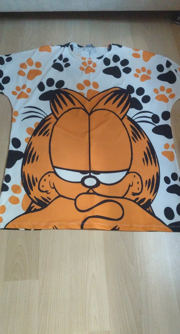 Renkli Garfield baskılı, pati desenli, pop kültür tarzında kahverengi kedi kıyafeti.
