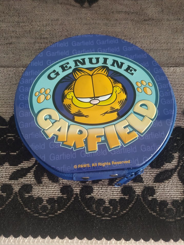 Garfield figürlü, renkli mavi kedi cd kutusu. Üzerinde 'GENUINE GARFIELD' yazısı ve lisanslıdır.