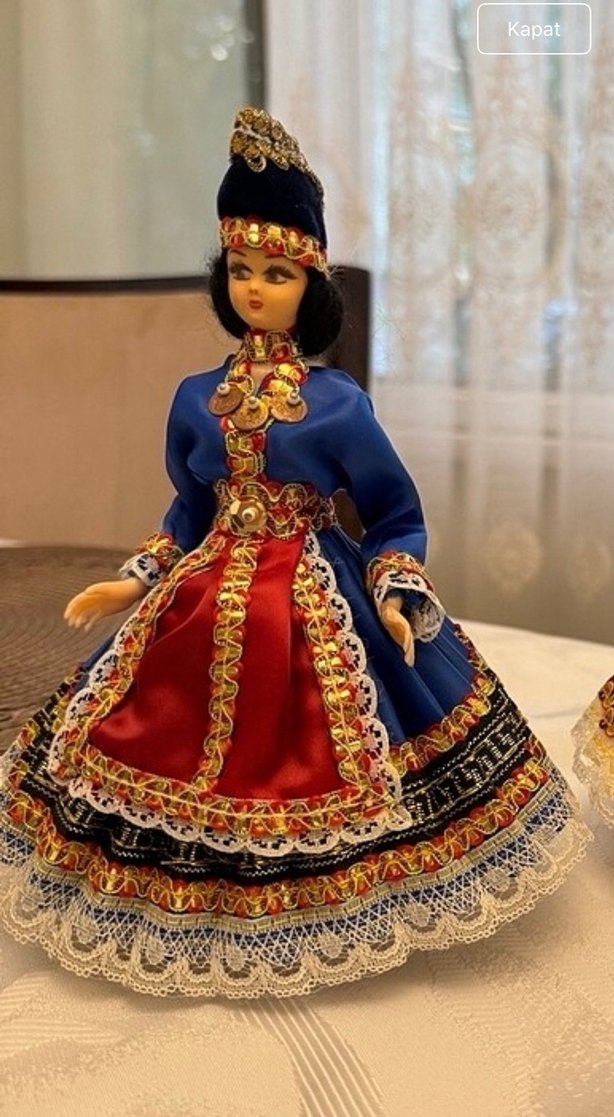 Mavi, kırmızı ve altın detaylı dantel süslemeli geleneksel kıyafetli renkli bebek. Koyu saç ve detaylı kostüm kültürel giysiyi vurgular.
