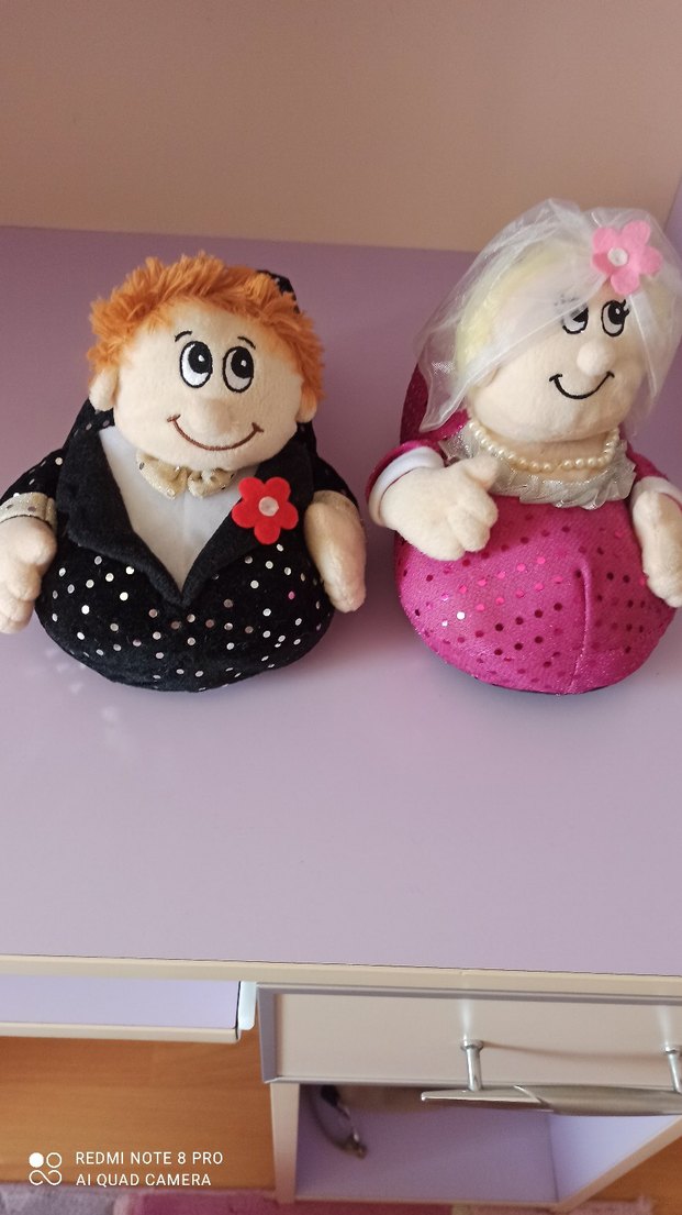 Renkli gelin ve damat peluş bebekler, gülen yüzlü ve detaylı kıyafetli. Yumuşak ve dekoratif. ev panduf