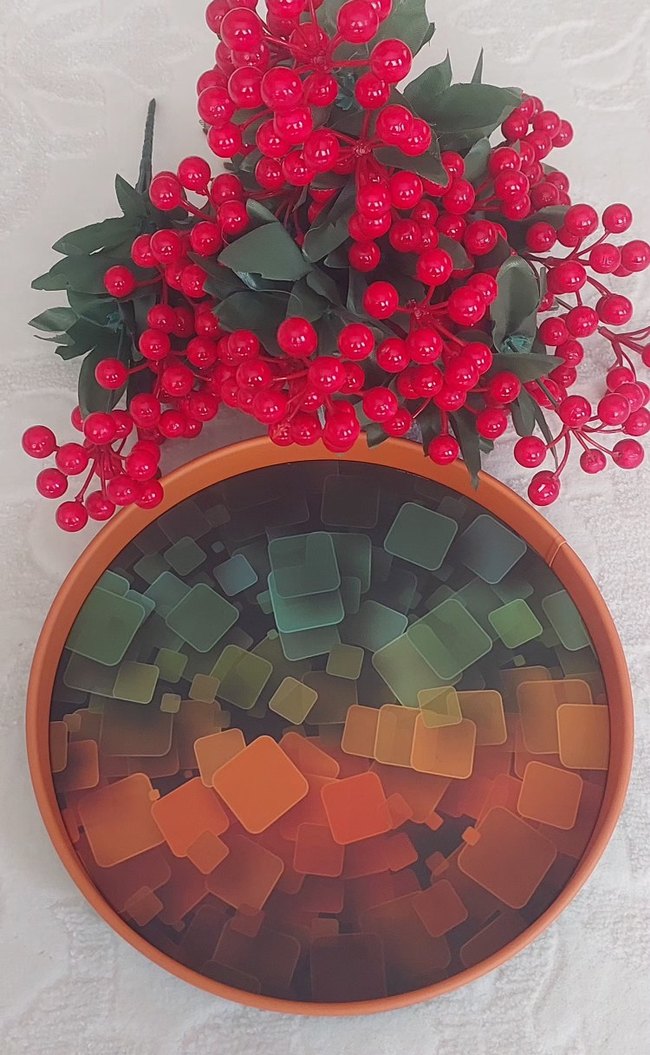 Renkli Geometrik Desenli metal tepsi 27 cm.ebatında