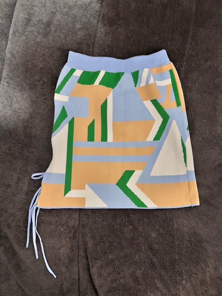 Renkli geometrik desenli, kısa ve bol kesim triko mini etek. Pastel tonlarda, çağdaş ve avangart tarzda, dış mekan kullanımı için uygun.