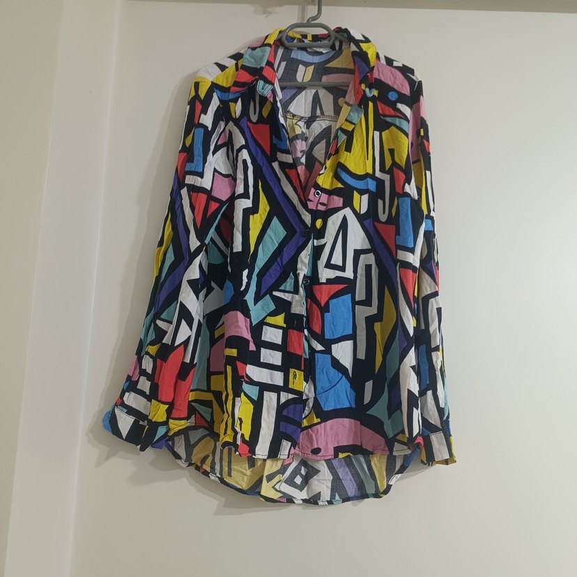 Renkli geometrik desenli, uzun kollu ve bol kesim kadın gömlek. Sentetik kumaştan, V yakalı ve drapeli tasarıma sahip, günlük kullanıma uygun.