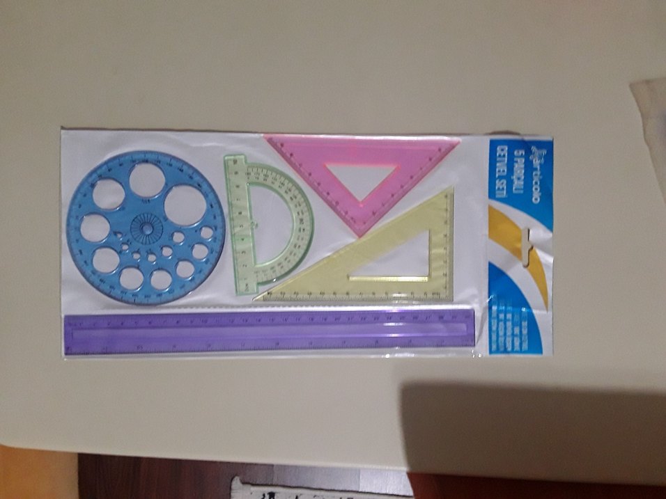 Okul etkinlikleri için açıölçer, gönye, büyük üçgen, küçük üçgen, çizim şablonu ve düz cetvelden oluşan renkli geometrik cetvel seti ✏️.