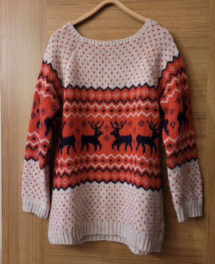 BEJ Renkli Geyik desenli, yuvarlak yakalı ve uzun kollu kadın triko kazak.