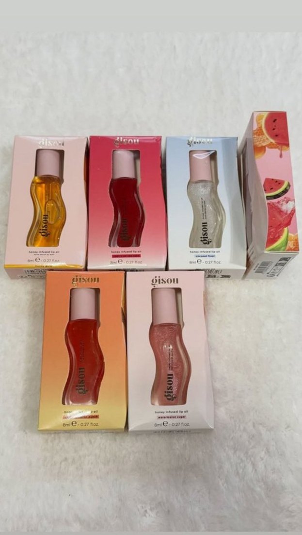 Çeşitli renklerde canlı ve parlak bitişli Gison dudak parlatıcıları seti. Her biri 8 ml kapasiteli şık şişede sunulmaktadır.