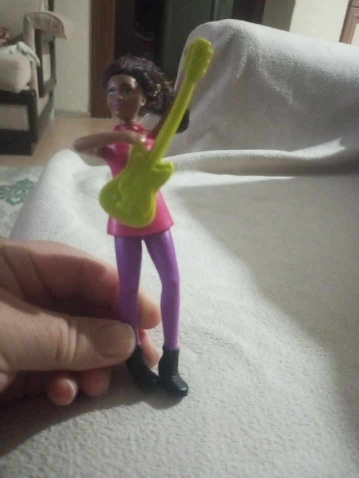 Bu renkli oyuncak bebek, sarı gitar tutuyor ve pembe üst ile mor pantolon giyiyor, siyah botlarla duruyor.