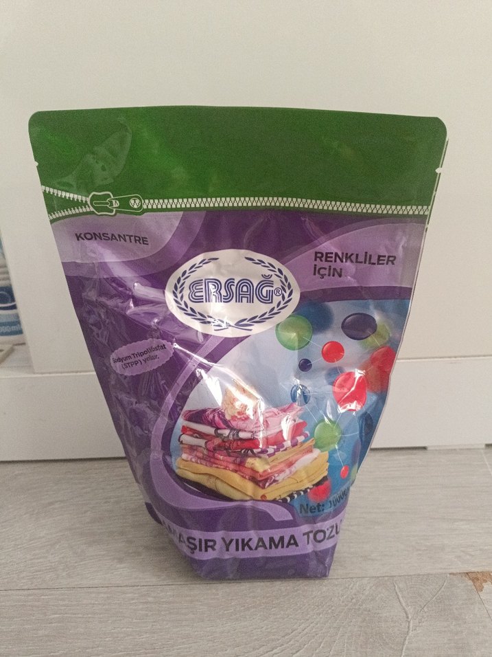Renkli giysiler için konsantre çamaşır yıkama tozu, etkili temizlik sağlar. Mor renkli, fermuarlı paketle kullanımı kolaydır.