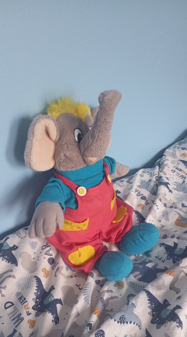 Gri fil peluş oyuncak, kırmızı tulum ve mavi gömlek giymiş, yumuşak kumaş ve sarı saç topuzuna sahip.