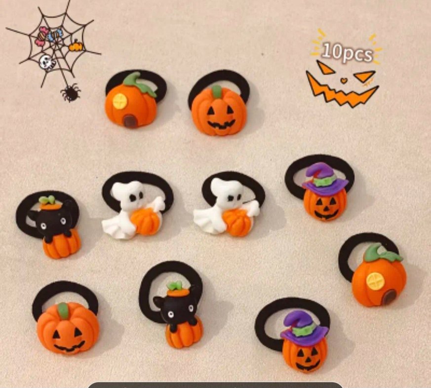 Renkli, lastikli saç tokaları; işlemeli balkabağı, hayalet ve cadı detaylarıyla gotik tarzda. 1 adet fiyatıdır