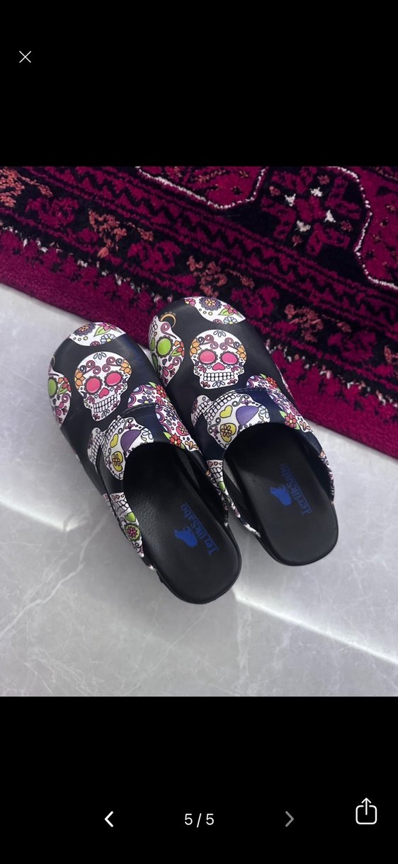 Renkli platform terlikler, canlı tie-dye kafatası desenine sahip, günlük kullanım için gotik punk tarzını yansıtıyor.