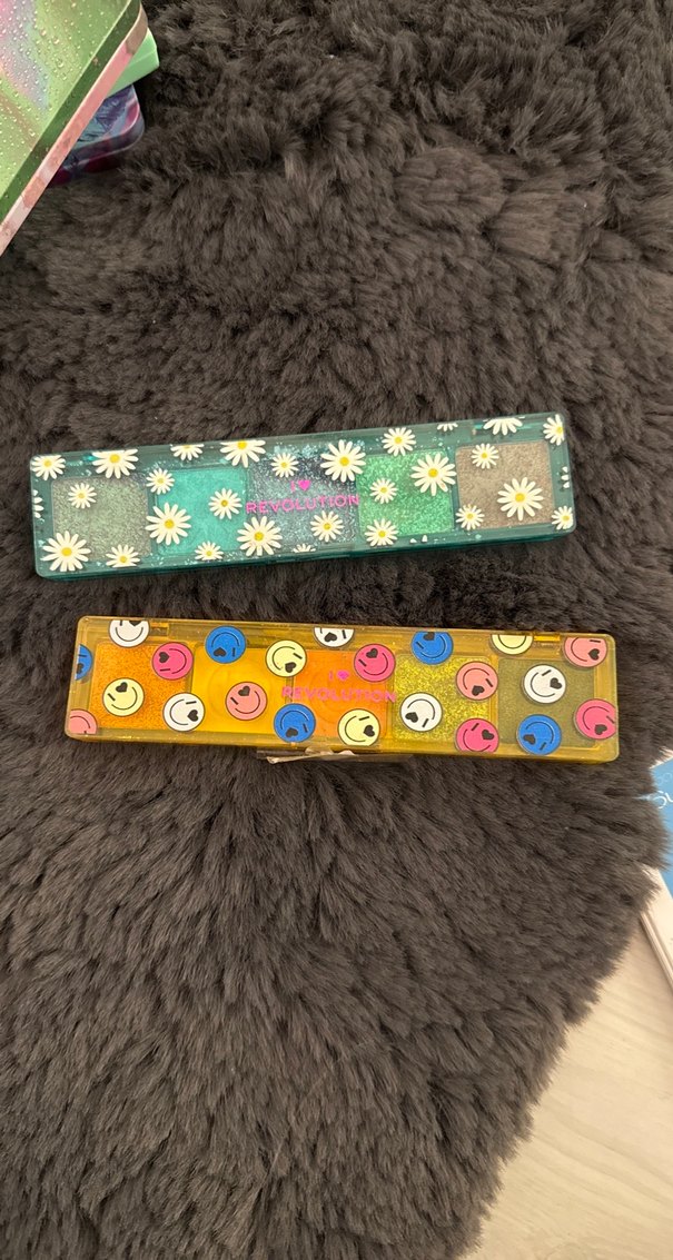 Çiçek ve gülen yüz desenli iki renkli göz farı paleti, çeşitli canlı renk seçenekleri sunar. Birinin ortadaki rengi kırık