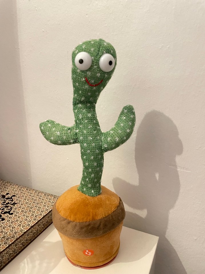 Büyük gözlü ve gülen yüzlü renkli kaktüs şeklinde müzikli oyuncak, yumuşak kahverengi saksıda. Sesleri taklit eder.