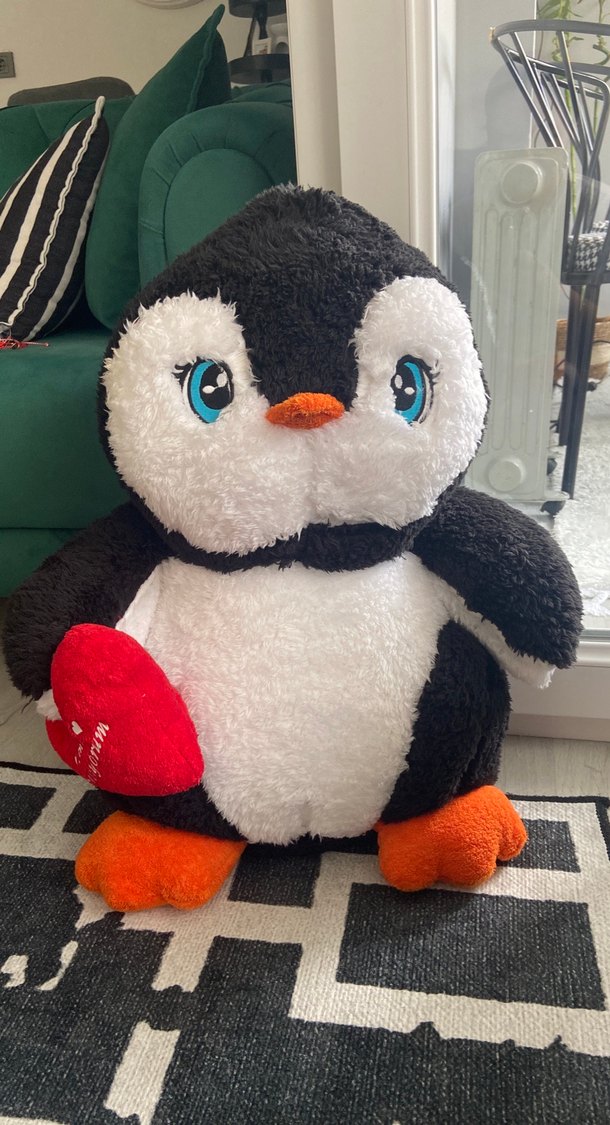 Renkli gözlere sahip, kırmızı kalp tutan yumuşak peluş penguen oyuncak. Siyah, beyaz ve turuncu renklere sahiptir.