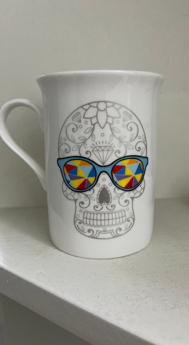 Beyaz seramik kupa üzerinde renkli geometrik gözlük takan kuru kafa deseni bulunur. ☕