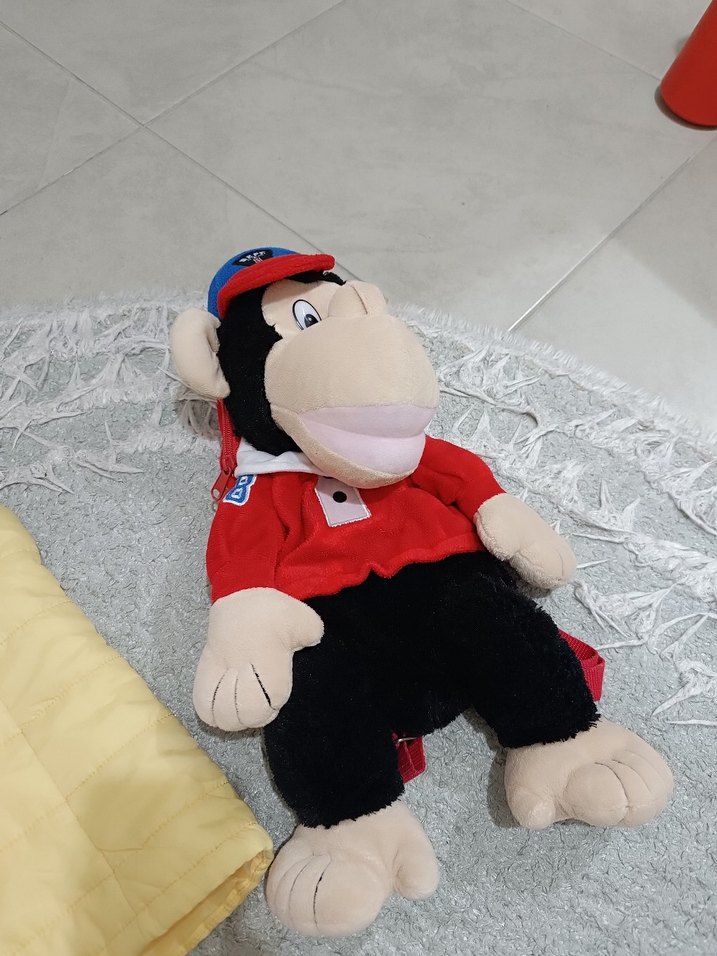 Renkli gri ve siyah yumuşak kumaştan yapılmış, kırmızı gömlek ve mavi şapkalı peluş maymun sırt çantası. Sarılmak ve oynamak için uygundur.